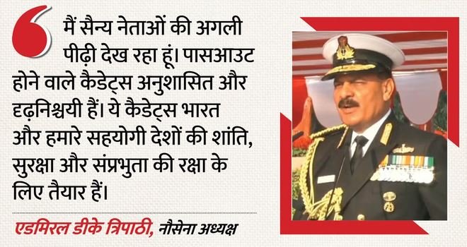 पासिंग आउट परेड में नौसेना अध्यक्ष एडमिरल डीके त्रिपाठी ने कहा, ‘मैं सैन्य नेताओं की अगली पीढ़ी देख रहा हूं।’ उन्होंने पासआउट होने वाले कैडेट्स के भविष्य को लेकर कहा कि अनुशासित, दृढ़निश्चयी कैडेट्स भारत और हमारे सहयोगी देशों की शांति, सुरक्षा और संप्रभुता की रक्षा के लिए तैयार हैं।